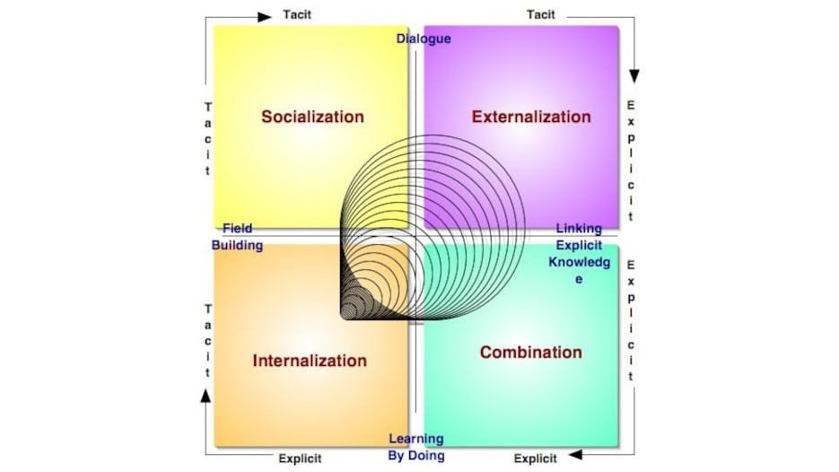 Knowledge management specifically aims at converting tacit knowledge into explicit knowledge and thereafter again into tacit knowledge in an ever growing cycle of expansion and regeneration. Called knowledge spirals by Nonaka and Takeuchi, such processes used to traditionally occur through informal and totally voluntary work groups who had particular knowledge, and are now being attempted in progressive organisations through the use of knowledge creating processes like Communities of Practice.